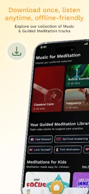 • Curated Music: Explore meditation music tracks to calm the mind & deepen practice