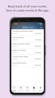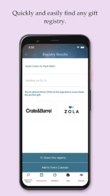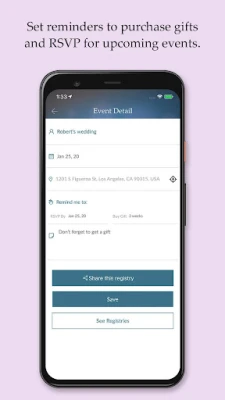 Easily keep track of all your events. Save or create events in the app when you're invited to a wedding, shower, or party to keep all of your plans and gifting organized.